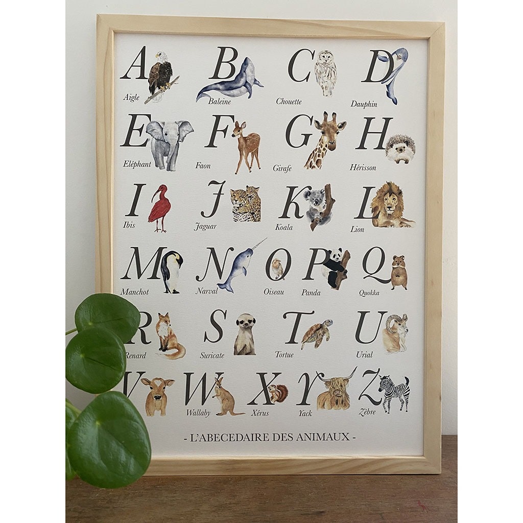Une affiche A3 éducative et décorative, qui ravira vos petits fans des animaux ! Elle est idéale pour apprendre son alphabet et décorer une chambre. L’affiche est encadrée dans un cadre en bois clair, elle est prête à être accrochée !
