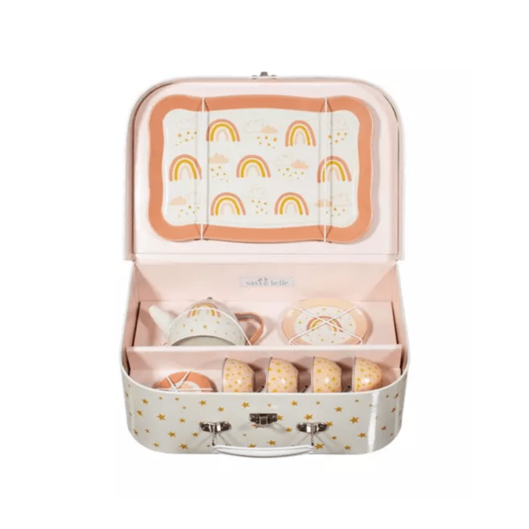 Ce joli service à thé arc-en-ciel est présenté dans une ravissante valisette en carton ! C’est parfait pour que les enfants puissent prendre un thé avec leurs copains, copines et faire comme les grands !