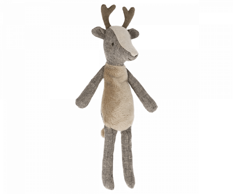 Cette peluche de papa cerf de Maileg en lin de couleur grise et beige est prêt a accueillir les câlins de votre enfant ! Il vit dans sa maison en pain d’épice avec le reste de la famille des cerfs.