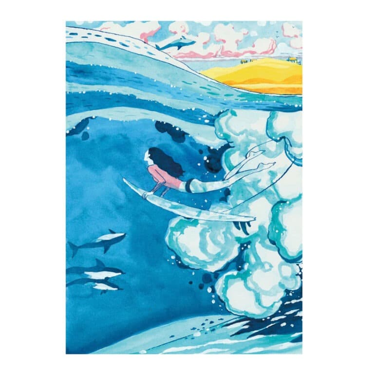Une jolie affiche d’une surfeuse sous une vague. Elle sera parfaite pour décorer une chambre mais aussi un salon !
