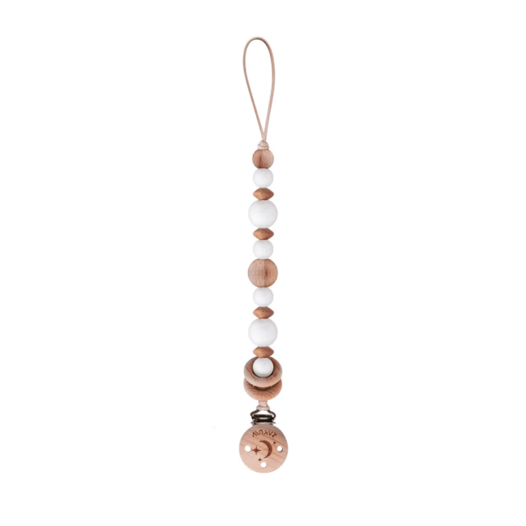 Cette attache tétine mercure “neige” avec des perles en silicone et en bois est vraiment jolie et pratique ! Elle permettra à votre tout petit de ne plus perdre sa tétine !