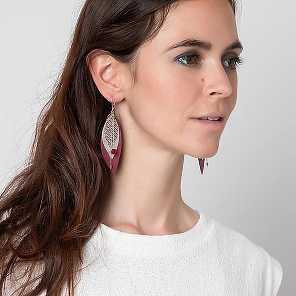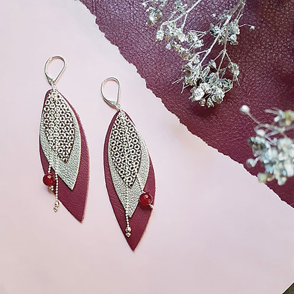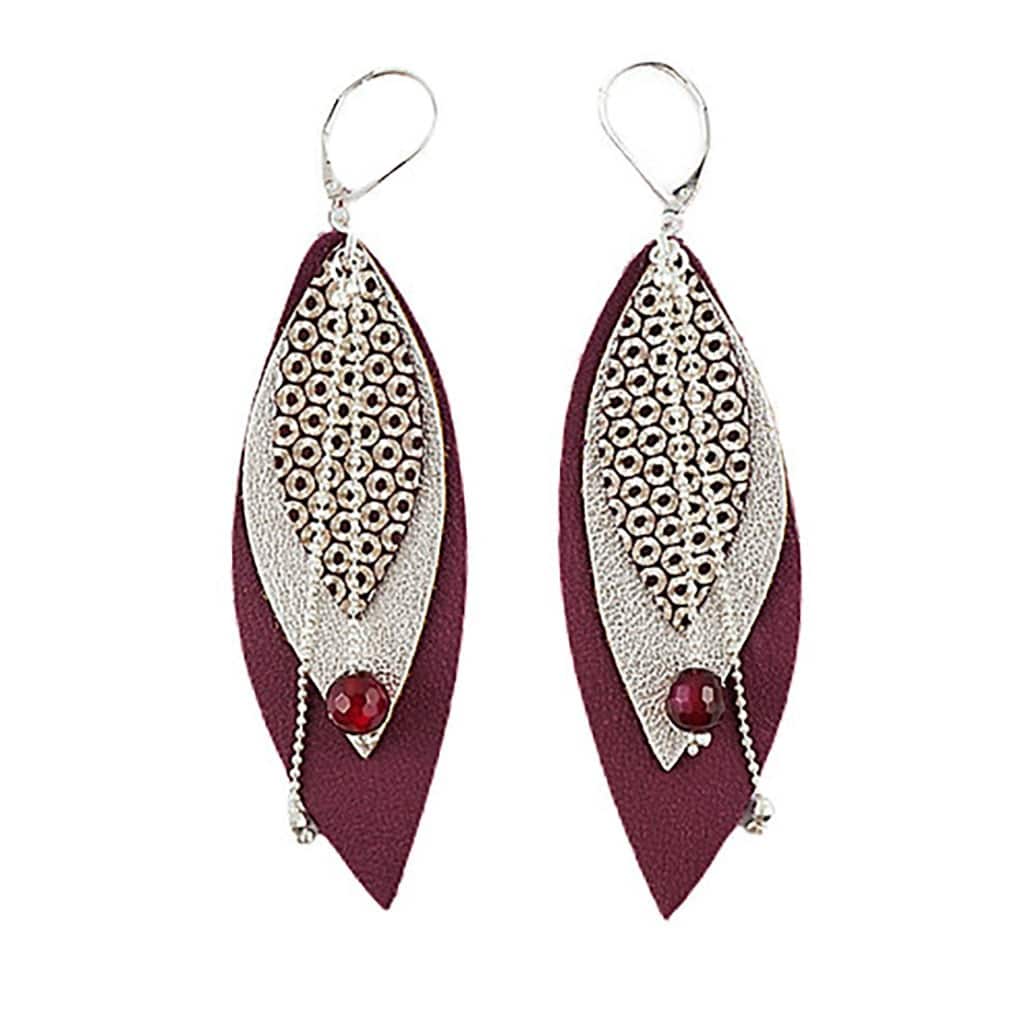 Les Boucles d’oreilles POP Prune mixent un trio de cuir (mordoré, champagne et prune) à des pierres naturelles facettées (Agate rouge).