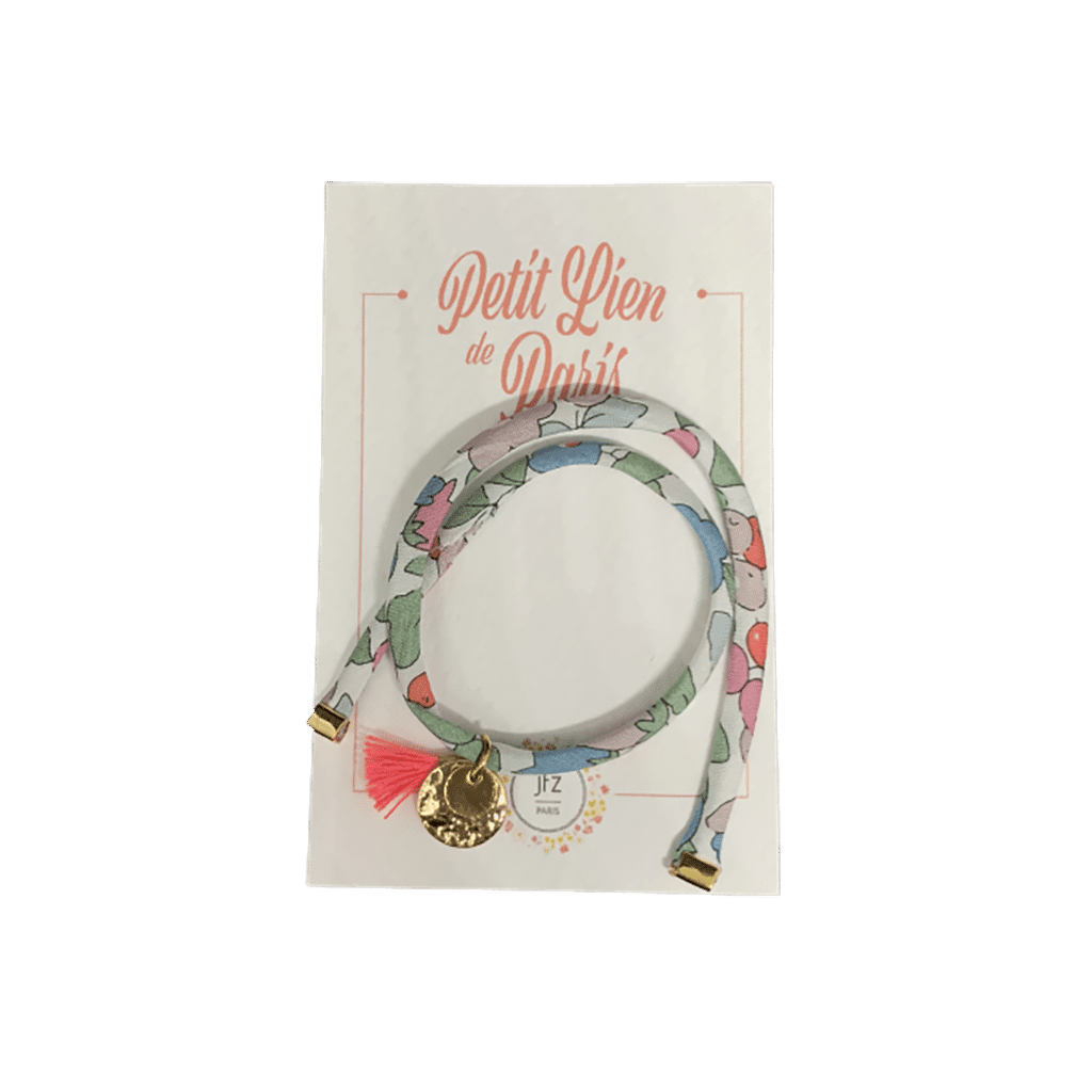 Ce bracelet liberty est fabriqué à la main en atelier à Paris, il est en tissu et se ferme avec un lien à nouer. Le bracelet est ajustable à toutes les tailles de poignets. Il est agrémenté d’une pampille dorée à l’or fin 24 carats et d’un pompon rose. C’est un bijou tendance pour les enfants et les adultes.