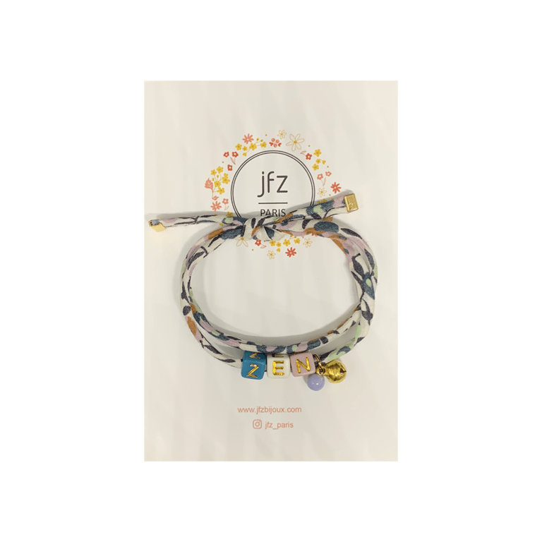 Ce bracelet liberty est fabriqué à la main en atelier à Paris, il est en tissu et se ferme avec un lien à nouer. Le bracelet est ajustable à toutes les tailles de poignets. Il est agrémenté de perles qui forment le mot “Zen” C’est un bijou tendance pour les enfants et les adultes.