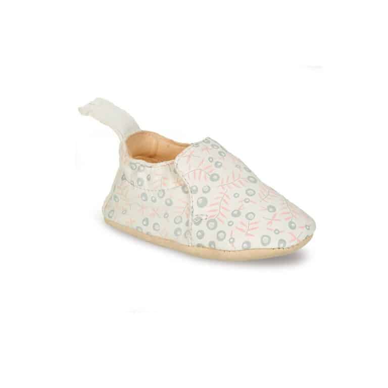 Ces jolis chaussons ” Blumoo ” couleur blanc aux motifs Liberty, accompagneront bébé à la crèche, à la maison ou même en extérieur.