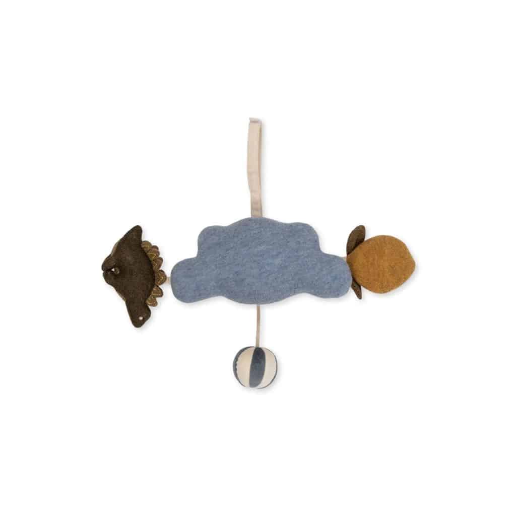 Ce jouet d’éveil en forme de nuage de la marque Konges Sløjd, possède un crocodile et un citron tout doux, à grelots, ainsi qu’un miroir et un petit ballon !