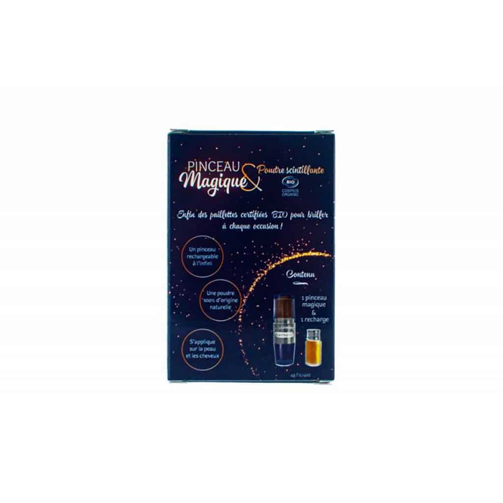 - Conseil d’utilisation : Versez la poudre scintillante dans l’embout du pinceau, revissez. Ensuite, enlevez le bouchon et faîtes coulisser le cylindre protégeant les poils. Secouez doucement les poils vers le bas puis passez le pinceau dans le creux de votre main pour faire descendre les paillettes.