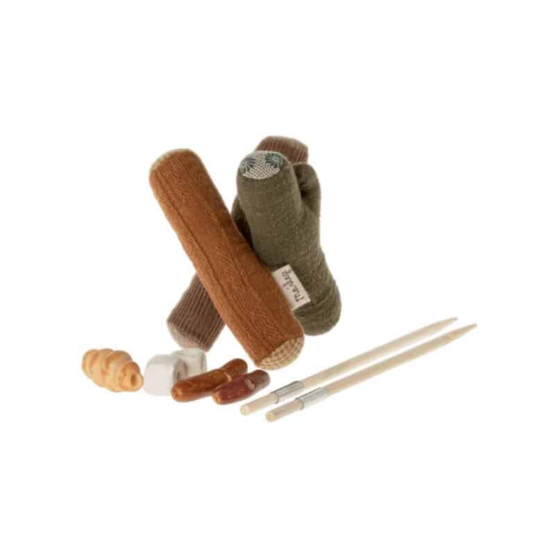 - Contient : Des buches de bois, deux brochettes, deux chamallows, un croissant et deux saucisses