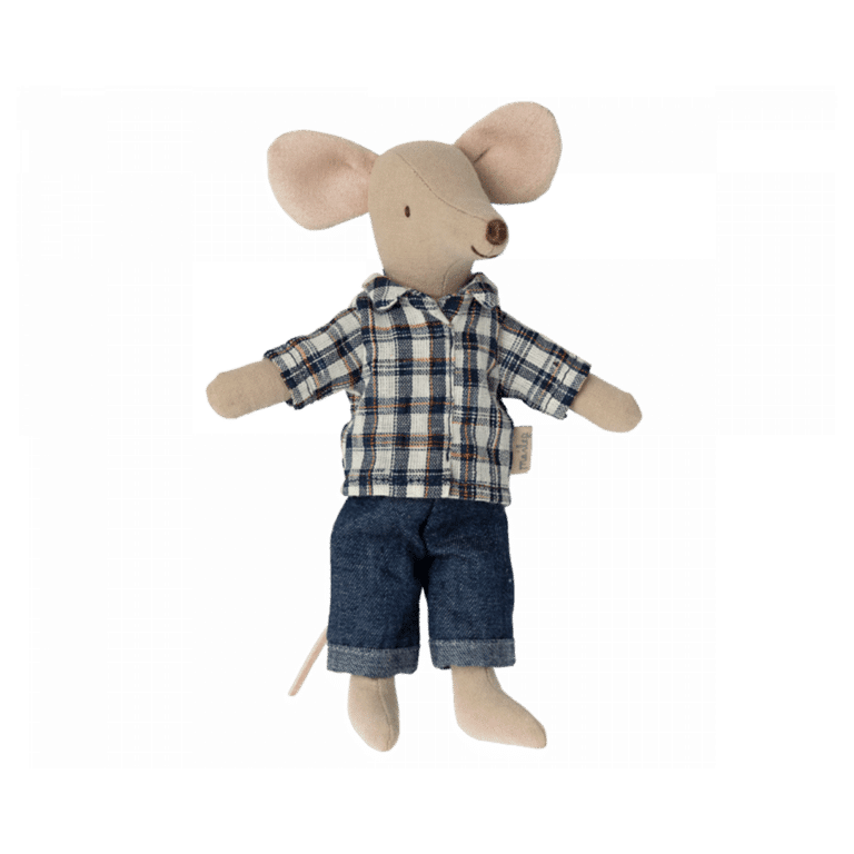 La souris Papa de Maileg est parfaite pour compléter la famille. Le papa porte une chemise à carreaux et un jean.