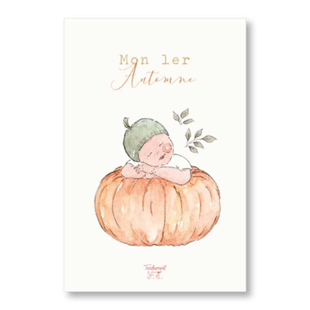 - Verso style carte postale avec une partie correspondance et adresse ainsi qu’une jolie phrase ” Fêter tendrement le premier Automne de bébé…”