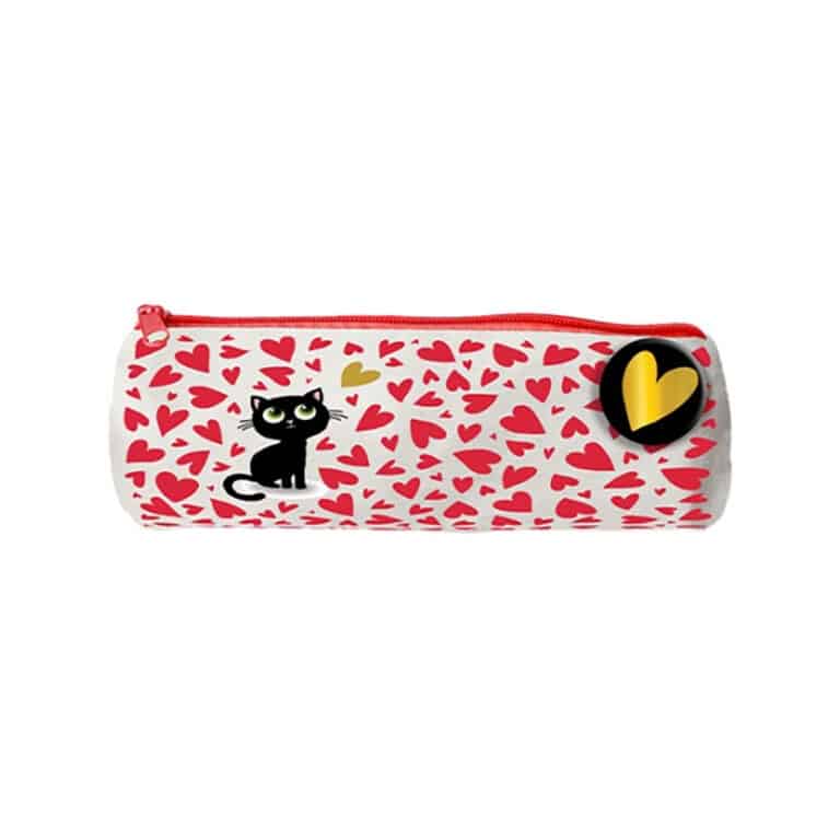Cette trousse ronde avec un chat et des cœurs dessins dessus, sera parfaite pour mettre ses stylos ou ses crayons de couleurs !