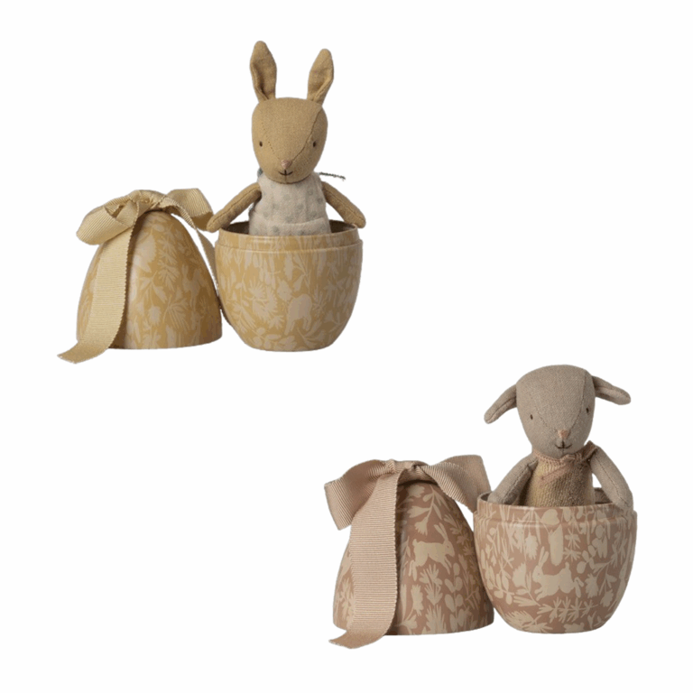 À l’ouverture, les enfants découvrent un tendre petit personnage prêt à devenir leur nouveau compagnon de jeu. Selon le modèle choisi, l’œuf renferme soit un lapin Micro vêtu d’une tenue à pois, soit un petit agneau tout doux. Une véritable petite scène pleine de poésie signée Maileg, la marque danoise au charme intemporel.